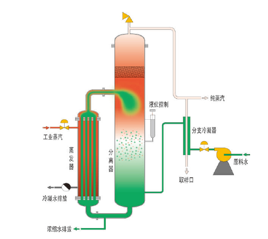 目前国内外的纯蒸汽发生器只能产出“饱和”纯蒸汽,对于远距离(如100m以上)的设备进行灭菌消毒时,由于蒸汽到达使用点时已产生了大量的凝结水,已不属于纯蒸汽了,而是饱和水喝饱和蒸汽的混合流体,因此灭菌消毒效果较差,尤其是300米以上的远距离工艺管道灭菌消毒,根本就达不到灭菌消毒的目的。